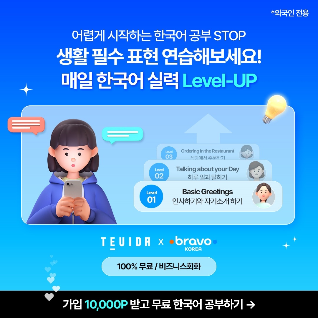 초급부터 중급까지 커버하는 고퀄리티 한국어 교육 콘텐츠가 매일 무료로 제공됩니다. 별도 학원에 등록하지 않아도, 앱 하나로 매일 조금씩 공부할 수 있어요. 외국인 유학생, 워킹홀리데이 참가자, 주재원 배우자에게 특히 유용해요!