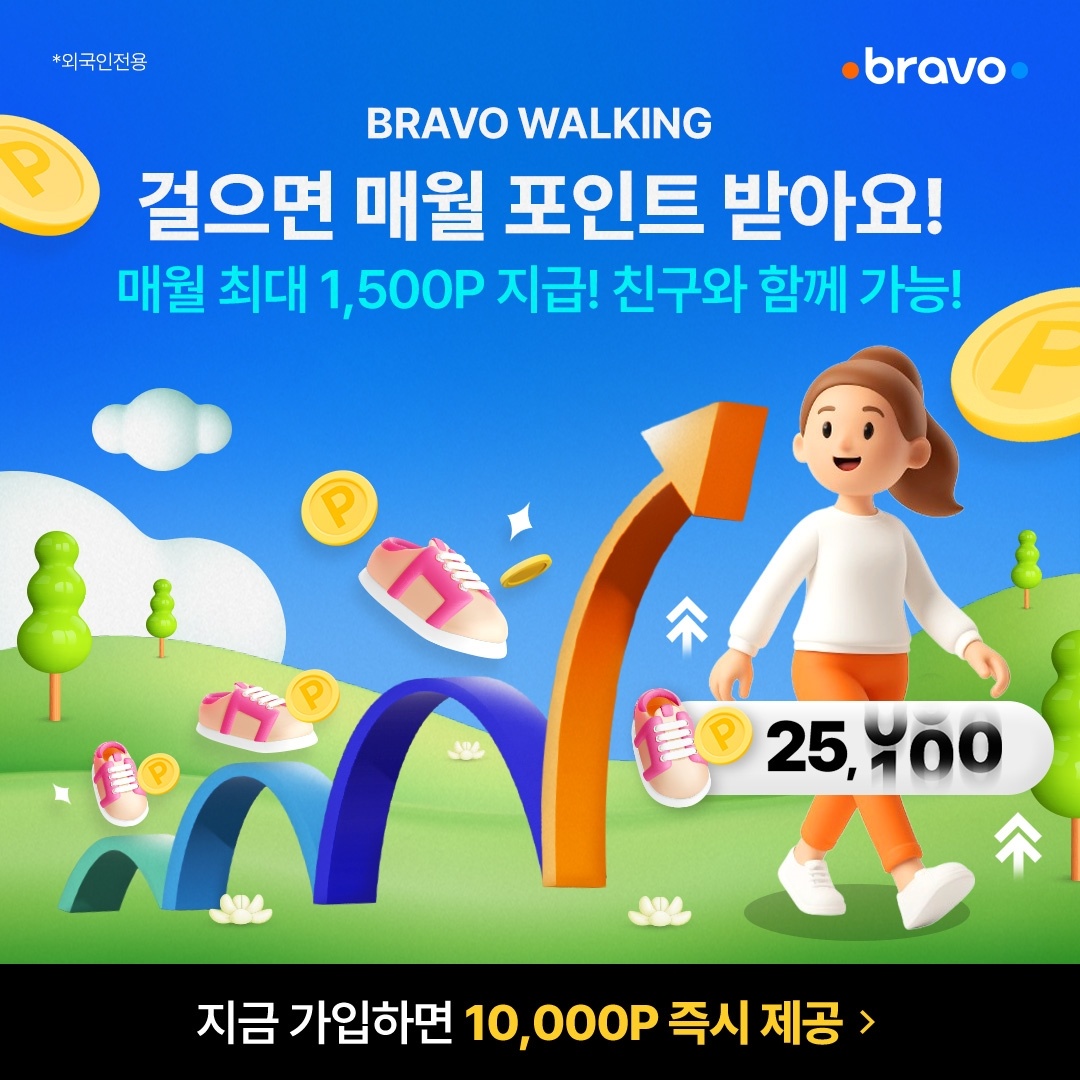 전북은행 Bravo Korea 앱 하나로 총 혜택 35,000P를 받고, 다양한 외국인들만을 위한 서비스들을 경험해보세요 ■Bravo Korea 가입 혜택 3가지 ①첫 신규 가입 시 10,000P 즉시 지급! (포인트 현금전환가능)