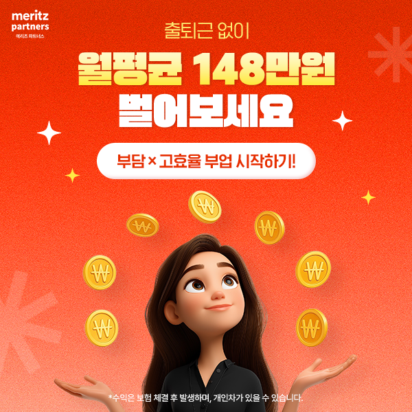 그래서 오늘은 출퇴근 없이, 초기 비용 없이, 내 시간을 유연하게 쓰면서도 월평균 148만 원 수익을 기대할 수 있는 ‘보험 부업’을 소개하려고 합니다. 바로 메리츠 파트너스 플랫폼입니다.