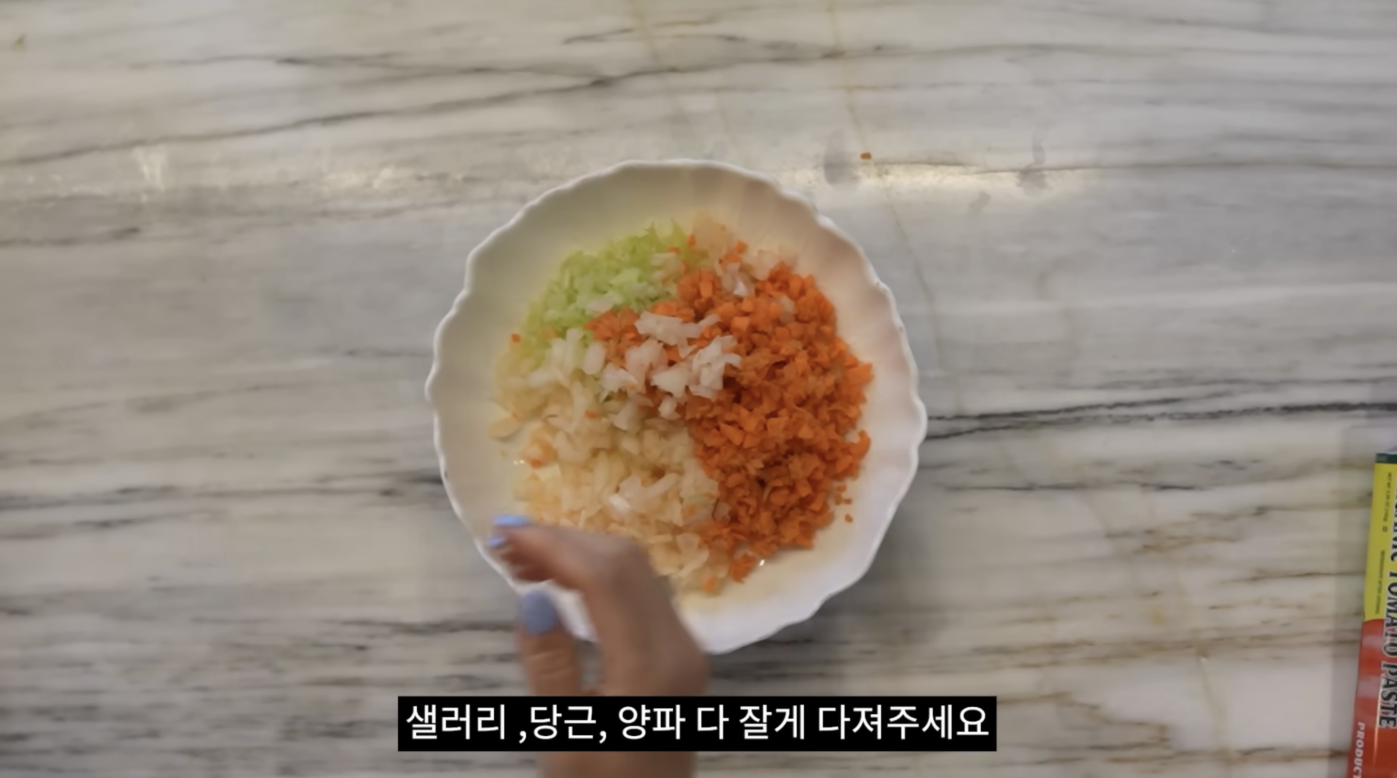 이어서 양파·당근·셀러리를 잘게 다져 넣습니다. (믹서 사용 금지, 반드시 칼로 다질 것)