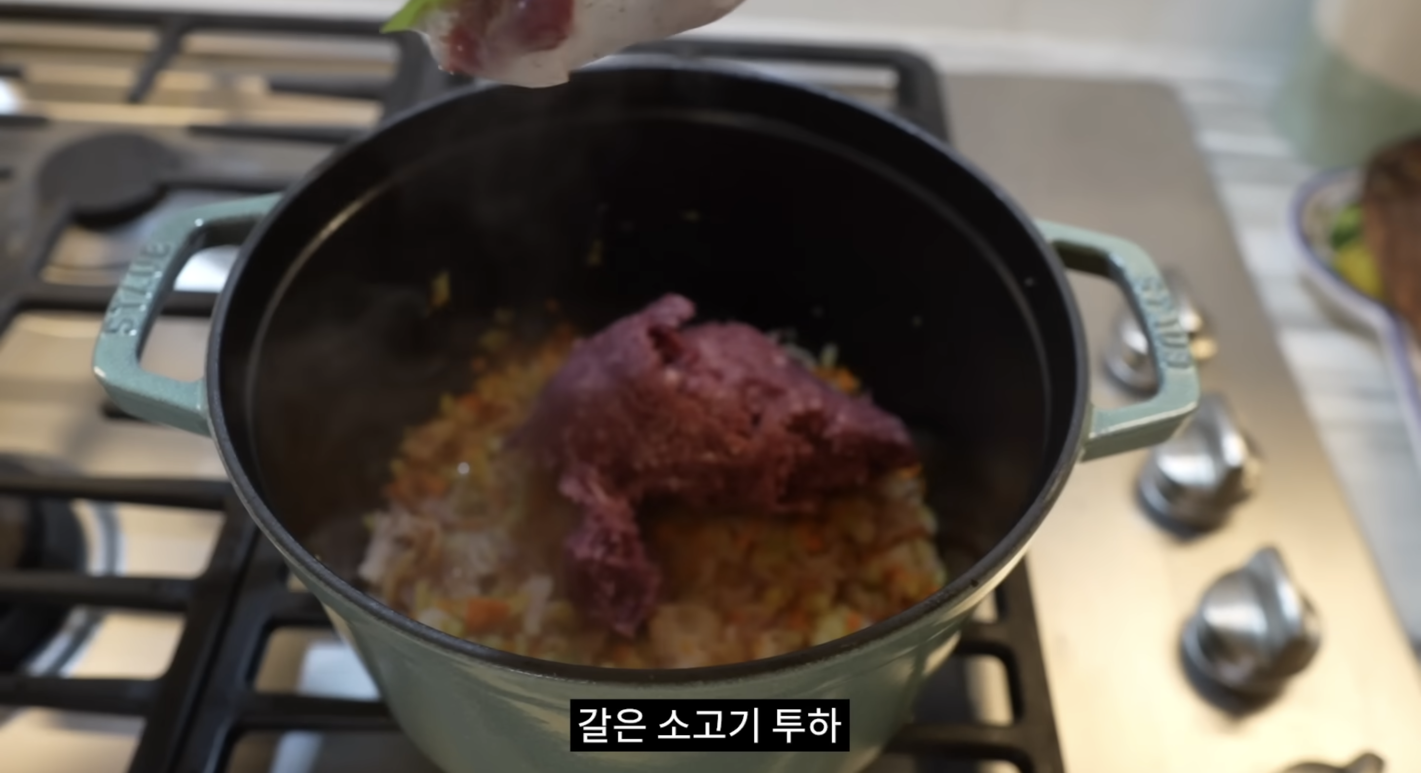 불을 올리고, 다진 소고기를 넣어 약 10분간 볶으며 수분이 날아가고 고기가 지글거릴 때까지 조리합니다.