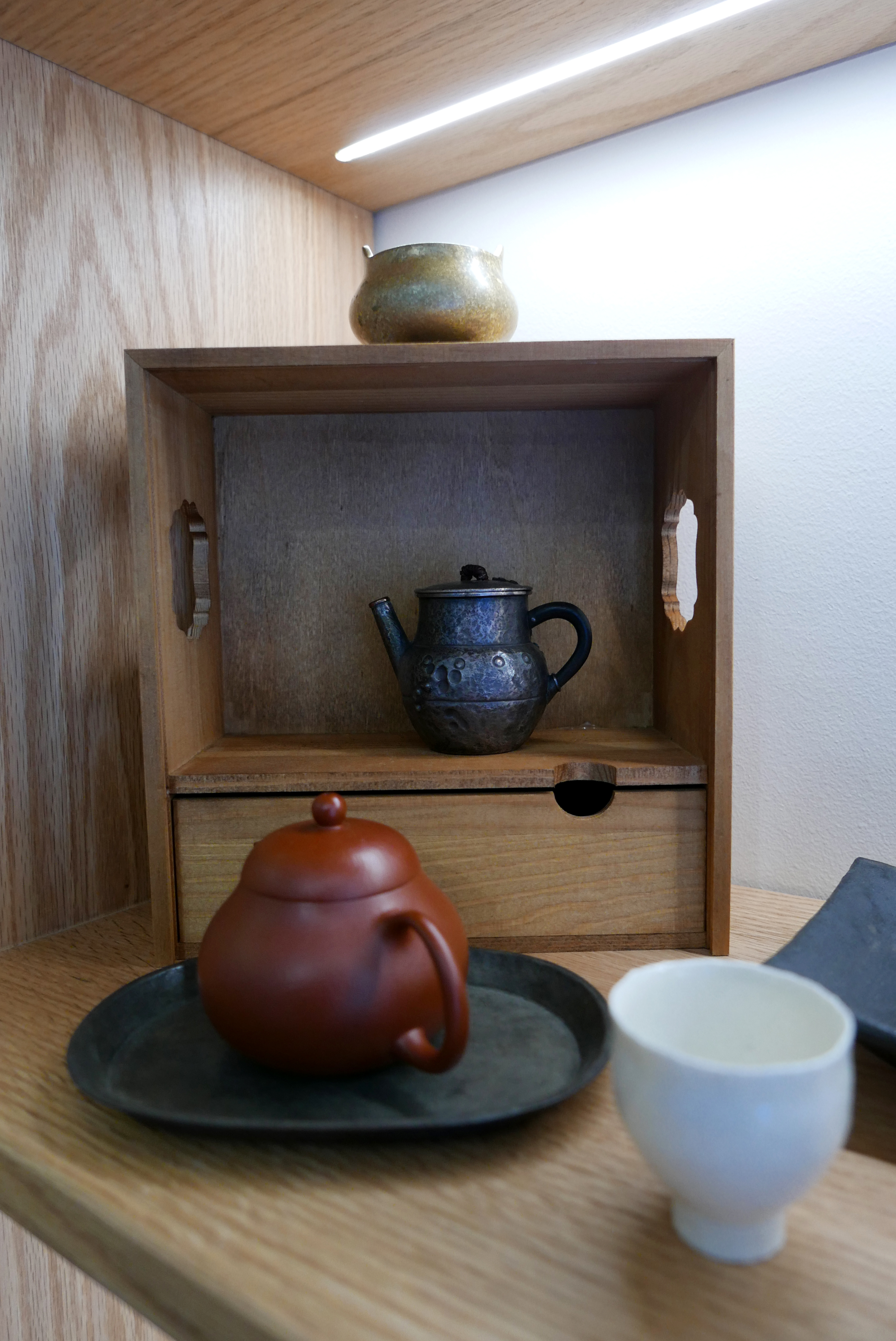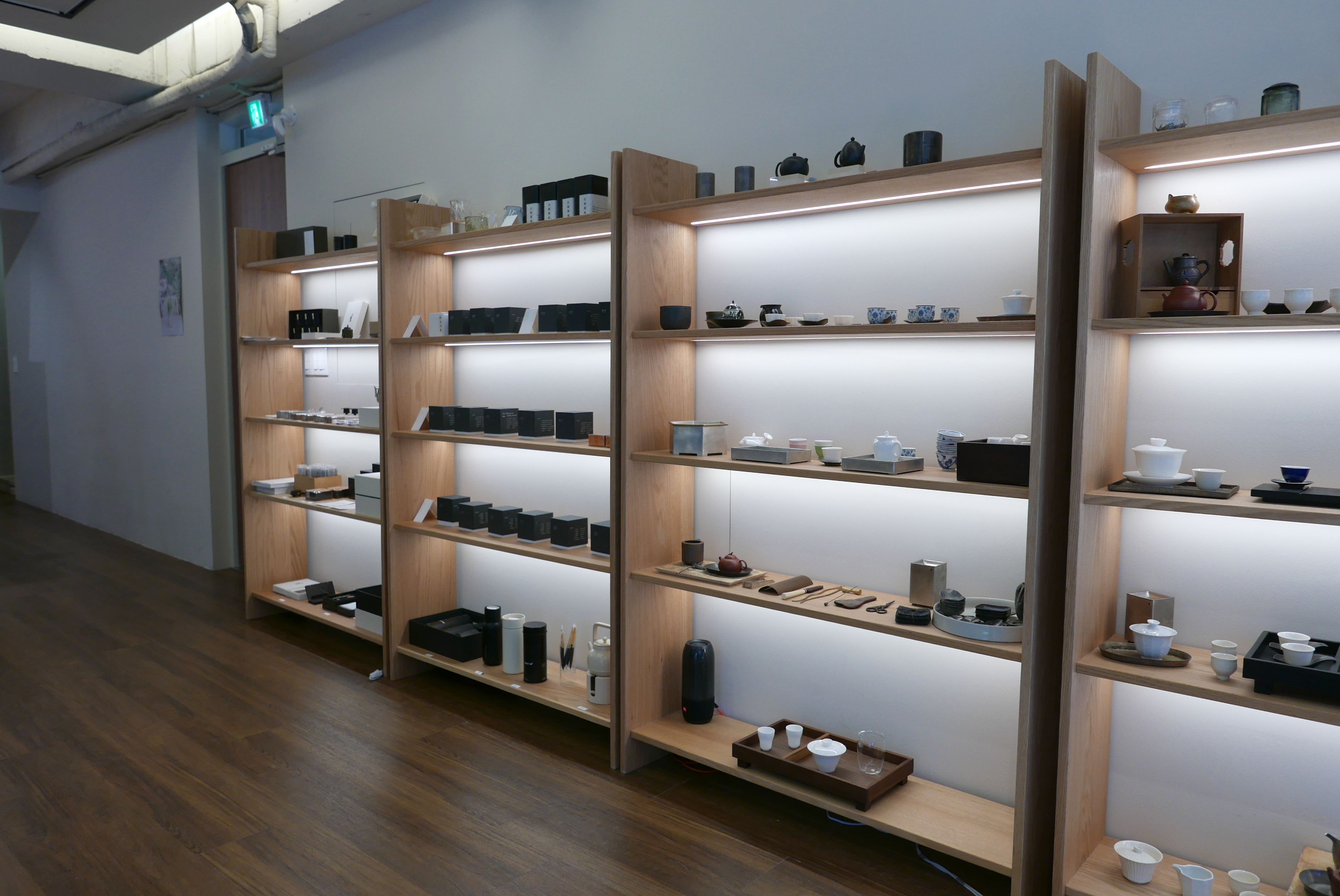 안으로 들어가면 티의 정갈함은 느낄 수 있고요. 한쪽에는 똑같은 수납장 4개에 온라인샵에서도 판매하고 있는 차, 차도구, 차도구, 인센스, 액세서리 등이 진열되어 있었어요.