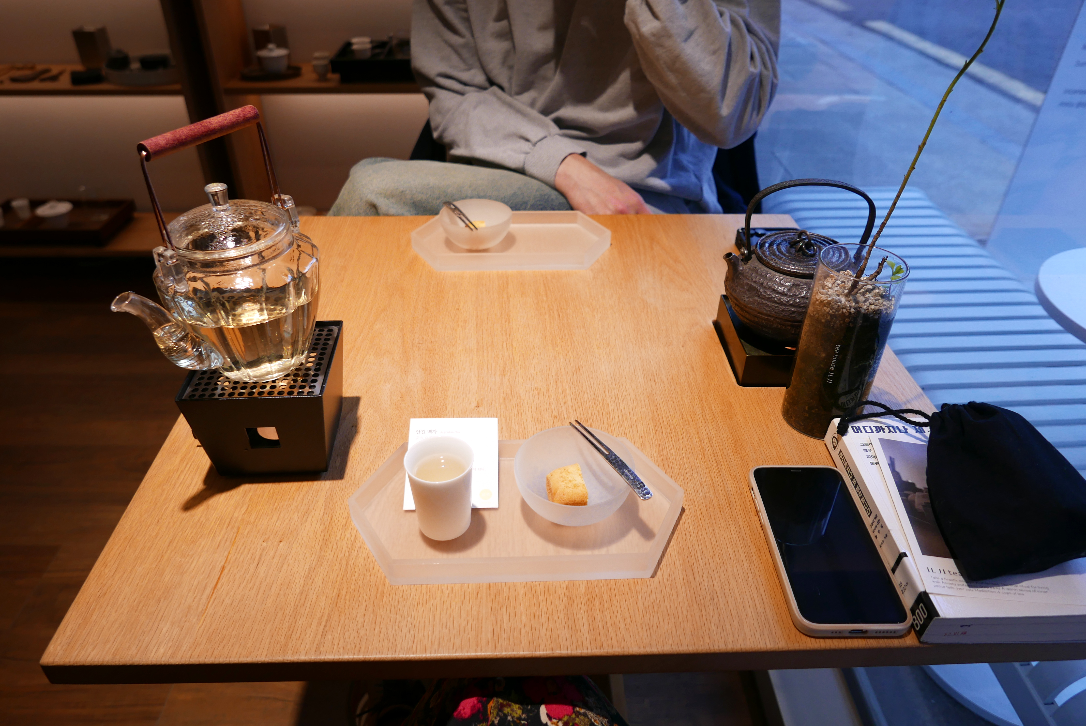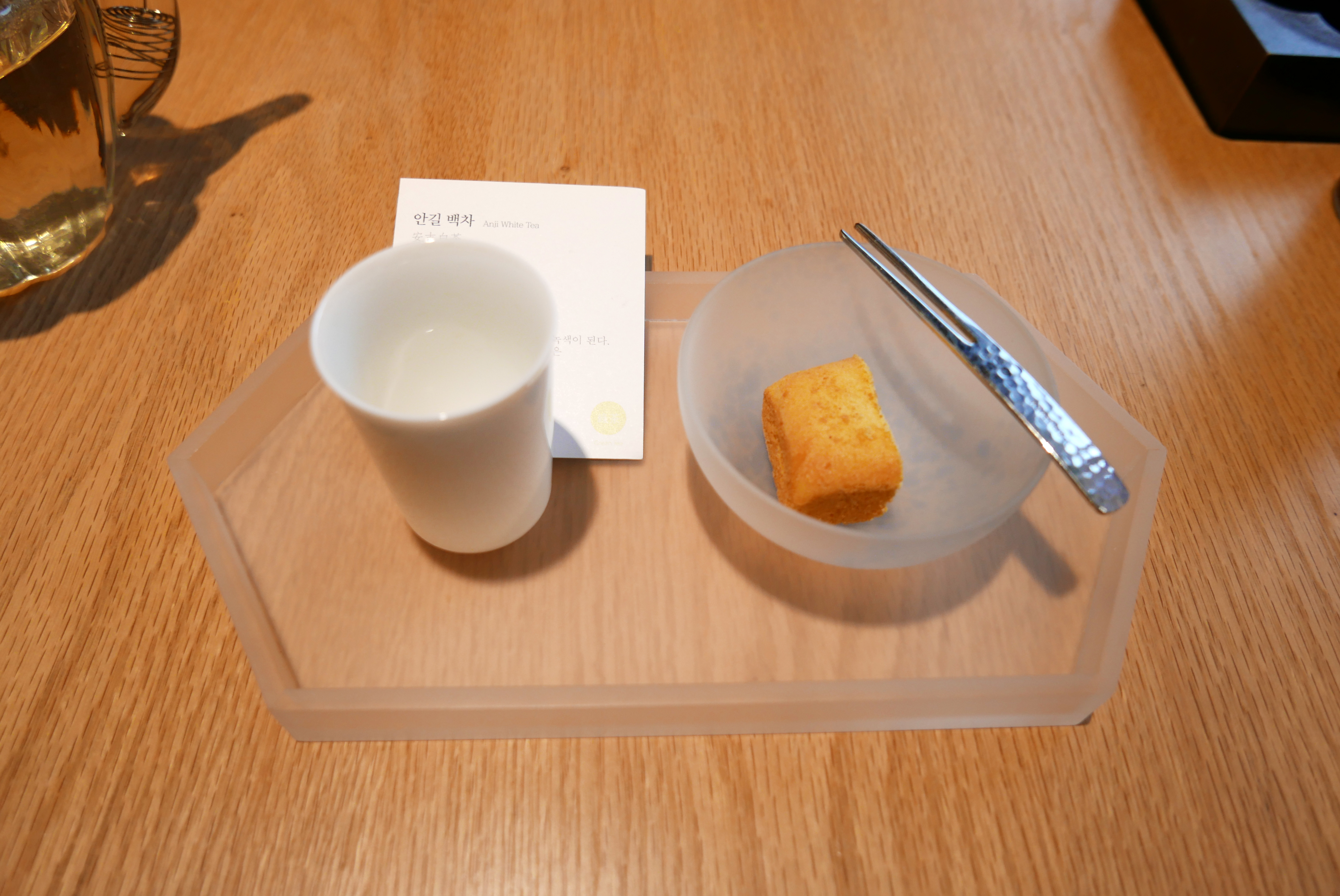 예약된 창가자리에 앉으니 바로 세팅을 해주셨어요. 다도 하면 완전히 제대로 정통스타일도 좋아하지만 요즘엔 이렇게 현대식으로 풀어낸 스타일도 세련되고 좋더라고요. 온전히 티에만 집중할 수 있게 테이블 세팅이 되었습니다. 다식으로 잼이 들어간 미니 케이크를 함께 주셨습니다. 중국과자 느낌 몬지알죠? 안에 들어간 잼은 아무래도 메뉴에 있던 파인애플케이크의 파인애플 잼인 거 같아요.